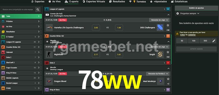 O 78ww oferece uma grande seleção de opções de apostas em e-sports com probabilidades competitivas